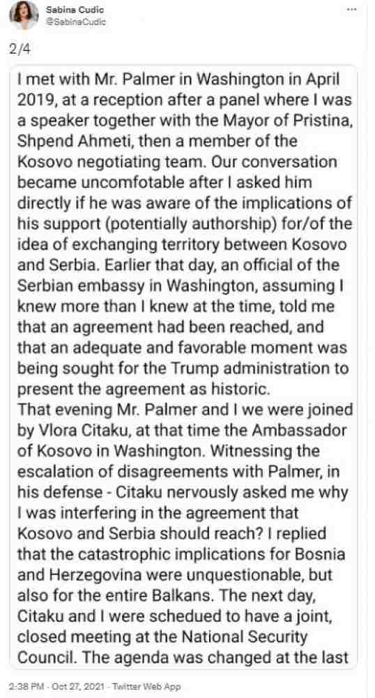 Kështu shkruan Sabina Çudiç, nënkryetarja e partisë boshnjake Nassa stranka, në Bosnje Hercegovinë, duke zbardhur edhe bisedat që ka patur me të dërguarin amerikan në rajon dhe planet e tij për ndarjen e Kosovës dy vite më parë.