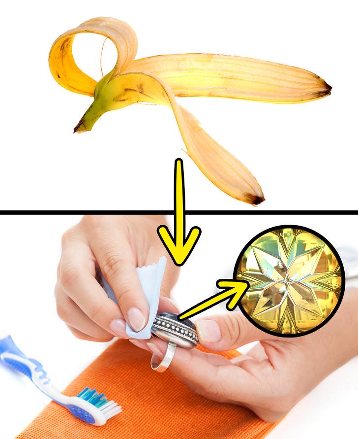 Merrni lëkurën e bananes dhe vendoseni në një makinë për bluarje. Shtoni një gjysmë gotë ujë, përzijeni deri sa të bëhet një masë homogjene. Fërkoni argjendin tuaj me këtë masë për disa minuta.