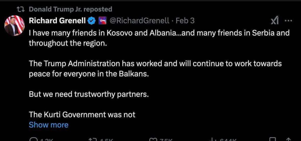 “Kam shumë miq në Kosovë dhe Shqipëri… dhe shumë miq në Serbi dhe në të gjithë rajonin. Administrata Trump ka punuar dhe do të vazhdojë të punojë për paqen në Ballkan. Por ne kemi nevojë për partnerë të besueshëm. Qeveria e Kurtit nuk ishte e tillë.”, ka shkruar Grenell në platformën “X”, përcjellë insajderi.