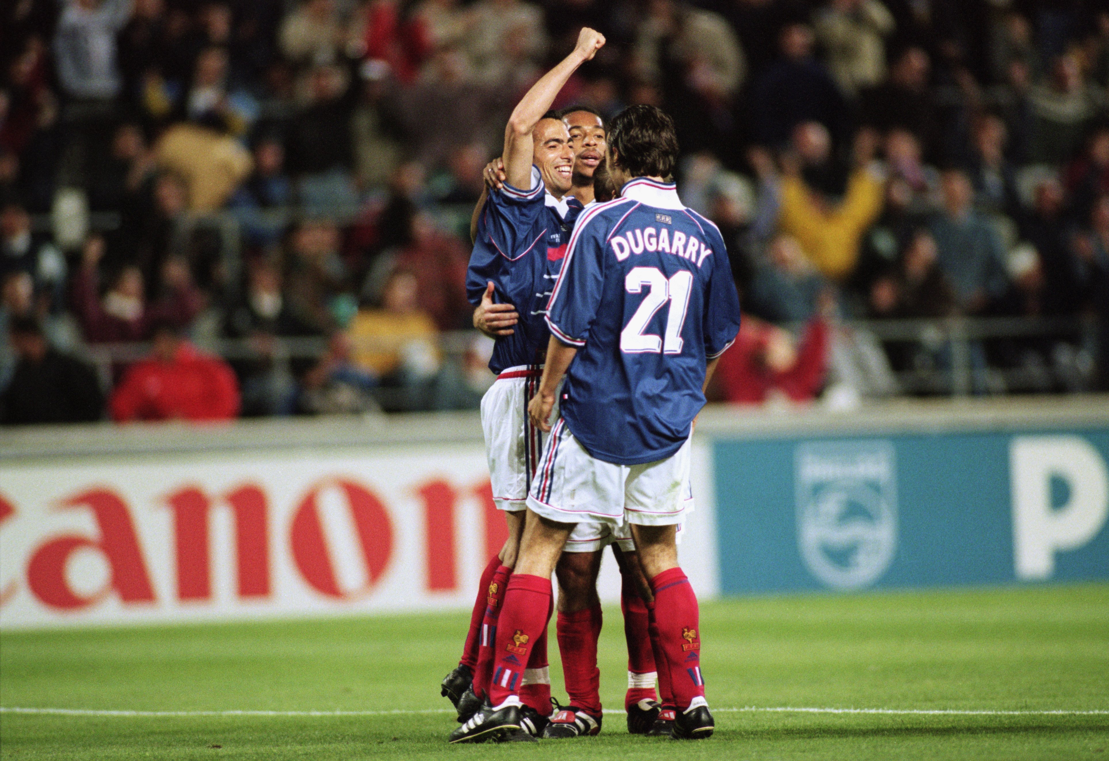 Christophe Dugarry, Youri Djorkaeff dhe Thierry Henry duke festuar një nga golat e Francës (Foto: Getty Images)