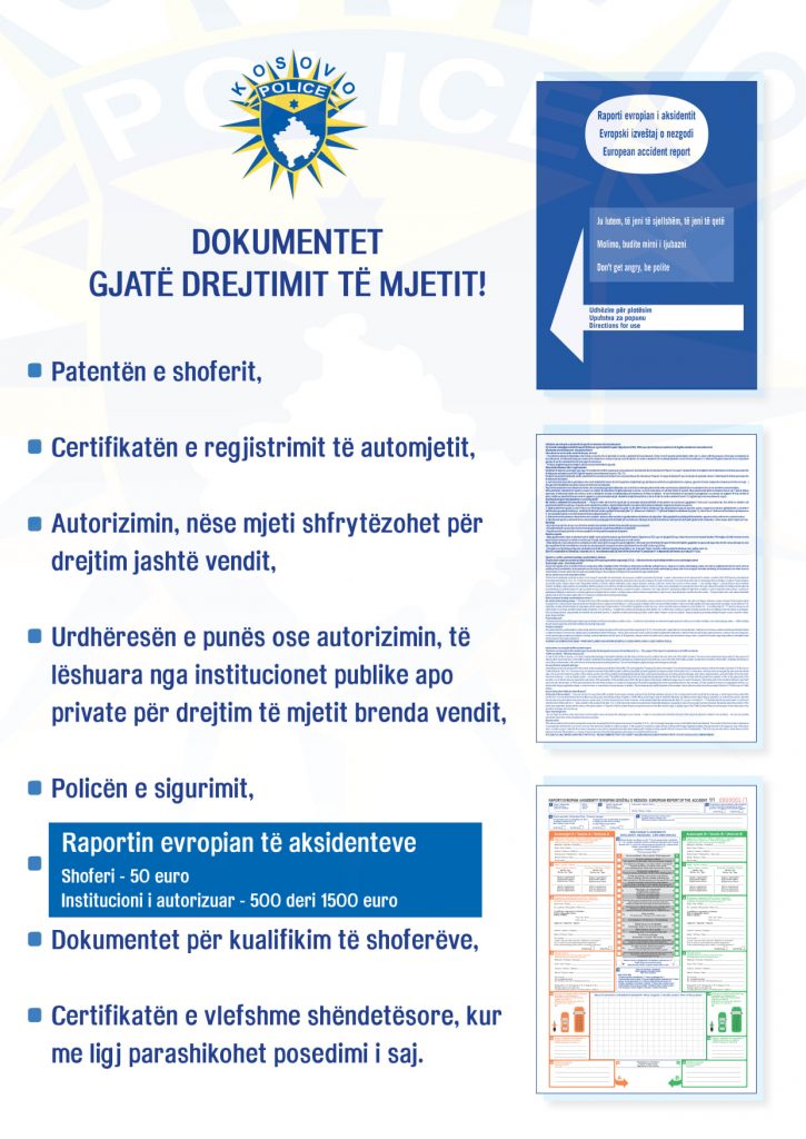 Sipas policisë, çdo vozitës duhet që patjetër të ketë patentë shoferin, certifikatën e regjistrimit të automjetit, autorizimi nëse mjeti shfrytëzohet jashtë vendit, policën e sigurimit, raportin evropian të aksidenteve, dokumentet për kualifikim të shoferëve, certifikatën e vlefshme shëndetësore, kur me ligj parashikohet posedimi i saj dhe urdhëresën e punës ose autorizimin, të lëshuara nga institucionet publike apo private për drejtim të mjetit brenda vendit.