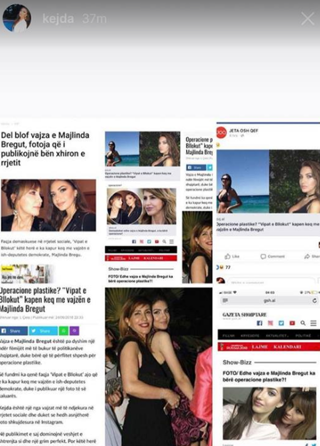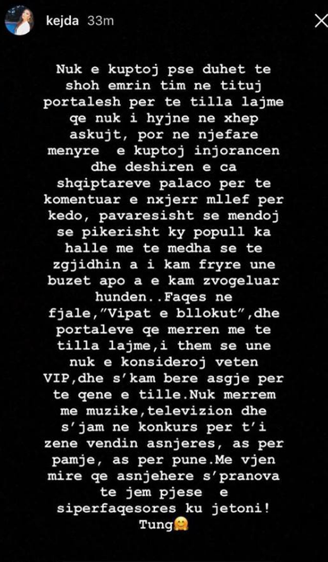 Por, vetëm sot, Kejda ka vendosur t’u mbyll gojën të gjithëve me këtë përgjigje, të cilën e ka bërë publike në instastory. Ajo shkruan: “Nuk e kuptoj pse duhet të shoh emrin tim në tituj portalesh për të tilla lajme që nuk i hyjnë askujt në xhep, por në një farë mënyre e kuptoj injorancën dhe dëshirën e ca shqiptarëve palaço për të komentuar dhe nxjerr mllef për këdo. Pavarësisht se mendoj se ky popull ka halle më të mëdha se të zgjidhin a i kam fryrë unë buzët apo a e kam zvogëluar hundën…Faqes në fjalë “Vipat e bllokut” dhe portaleve që merren me të tilla lajme i them se unë nuk e konsideroj veten VIP, dhe s’kam bërë asgjë për të qenë e tillë. Nuk merrem me muzikë, televizion dhe s’jam në konkurs për t’i zënë vendin asnjërës, as për pamje, as për punë. Më vjen mirë që asnjëherë s’pranova të jem pjesë e sipërfaqësores ku ju jetoni! Tung!”