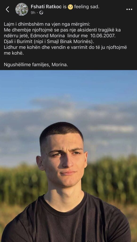 “Lajm i dhimbshëm na vjen nga mërgimi: Me dhembje njoftojmë se pas një aksidenti tragjik ka ndërruar jetë Edmond Morina, i lindur më 10.06.2007. Lidhur me kohën dhe vendin e varrimit do të ju njoftojmë me kohë”, thuhet në njoftimin e publikuar.