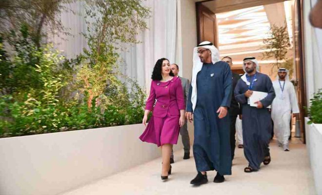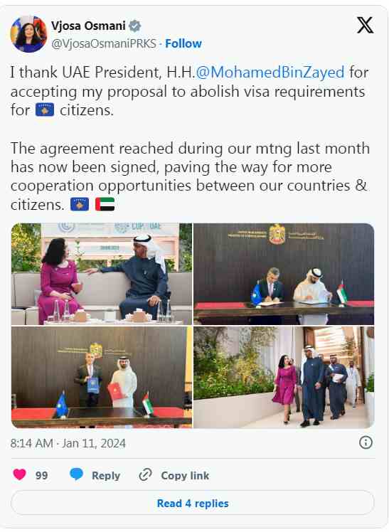 “Falënderoj Presidentin e Emirateve të Bashkuara Arabe, Mohamed Bin Zayed për pranimin e propozimit tim për heqjen e vizave për qytetarët e Kosovës. Marrëveshja e arritur gjatë takimit tonë muajin e kaluar tashmë është nënshkruar, duke hapur rrugën për më shumë mundësi bashkëpunimi midis vendeve dhe qytetarëve tanë”, k shkruar Osmani në platformën X.