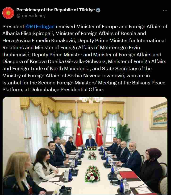 ‘’Presidenti Recep Tayyip Erdogan priti Ministren për Evropën dhe Punët e Jashtme të Shqipërisë, Elisa Spiropali; Ministrin e Punëve të Jashtme të Bosnjë dhe Hercegovinës, Elmedin Konaković; Zëvendëskryeministrin për Marrëdhënie Ndërkombëtare dhe Ministrin e Punëve të Jashtme të Malit të Zi, Ervin Ibrahimović; Zëvendëskryeministren dhe Ministren e Punëve të Jashtme dhe Diasporës të Kosovës, Donika Gërvalla-Schwarz; Ministrin e Punëve të Jashtme dhe Tregtisë së Jashtme të Maqedonisë së Veriut; si dhe Sekretaren e Shtetit të Ministrisë së Punëve të Jashtme të Serbisë, Nevena Jovanović.