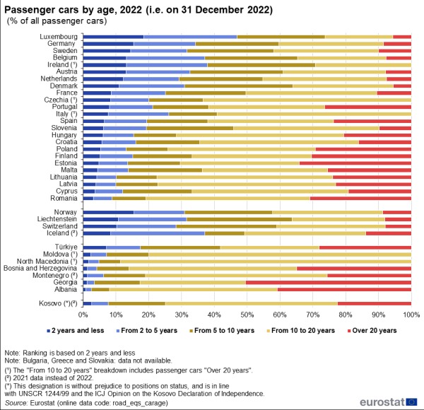 Ndërsa në Kosovë, 22.6% e automjeteve për pasagjerë kanë vit prodhimi prej 20 vitesh ose më shumë, dhe në Mal të Zi, 25.6%.