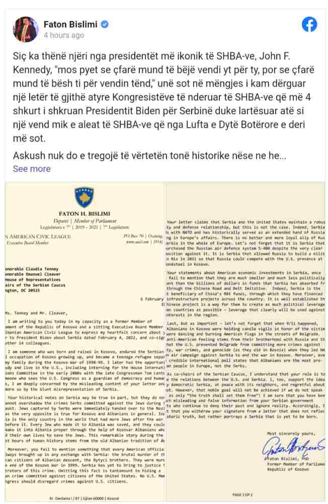 Bislimi ka shkruar në Facebook se kongresistëve ua ka bërë me dije se letra që i është dërguar Presidentit Biden është e mbushur me të pavërteta.