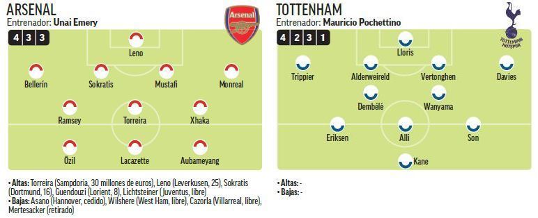 Arsenal (4-3-3): Leno; Bellerin, Sokratis, Mustafi, Monreal; Ramsey, Torreira, Xhaka; Ozil, Lacazette, Aubameyang.