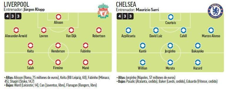 Cheslea (4-3-3): Courtois; Azpilicueta, Luiz, Cahill, Alonso; Kante, Jorginho, Bakayoko; Willian, Morata, Hazard.