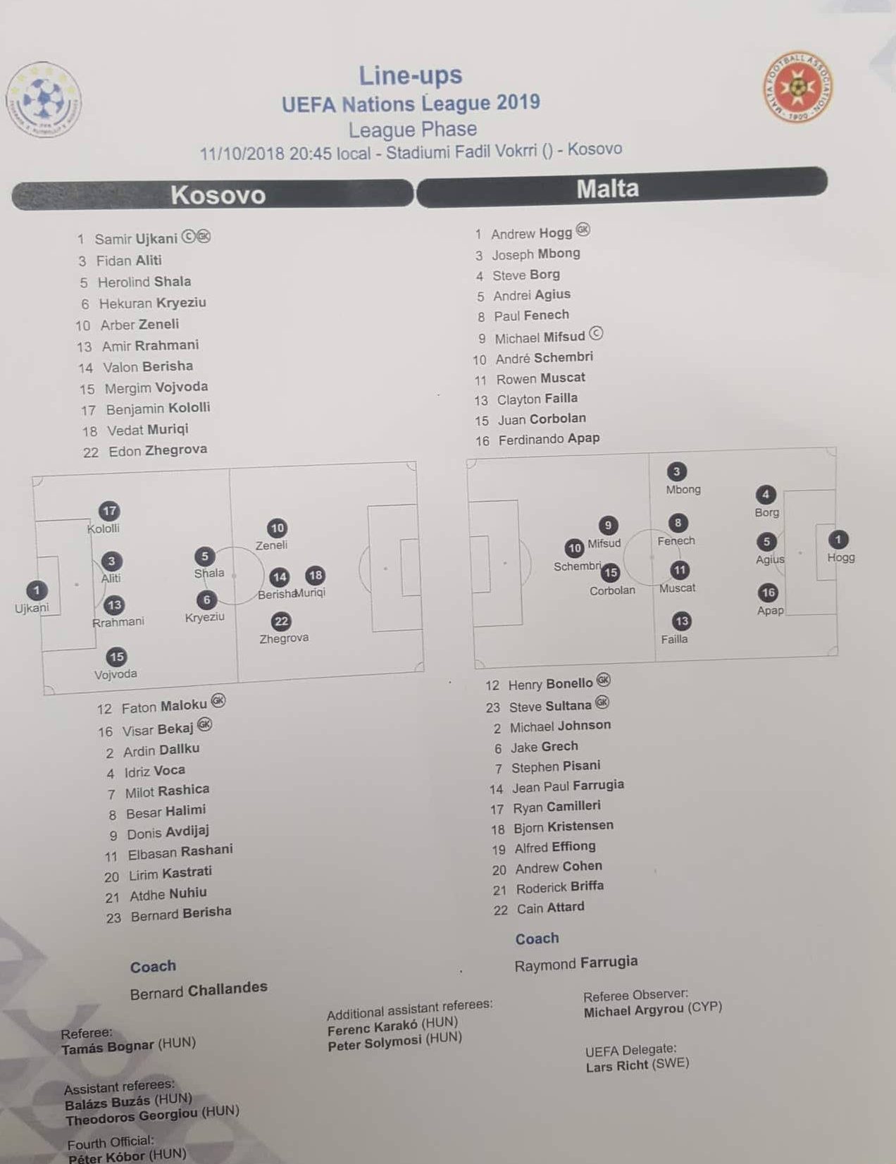 Formacioni startues i Maltës: Andrew Hogg, Joseph Mbong, Steve Borg, Andrei Agius, Paul Fenech, Michael Mifsud, Andre Schembri, Rowen Muscat, Clayton Failla, Juan Corbolan, Ferdinando Apap.