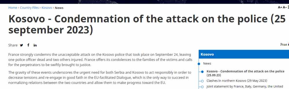 Franca e ka dënuar një sulm të tillë duke e konsideruar si sulm të papranueshëm në Kosovës që la të vdekur një polic të Kosovës dhe plagosi dy të tjerë.