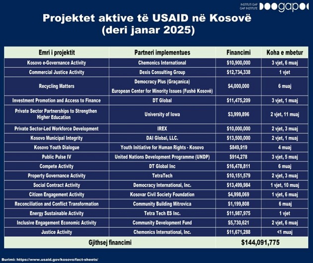 Instituti GAP tha se në Kosovë ky vendim i presidentit amerikan Donald Trump i ndikon rreth 17 projekte aktive të financuara nga USAID që japin kontribut të rëndësishëm në zhvillimin e vendit.
