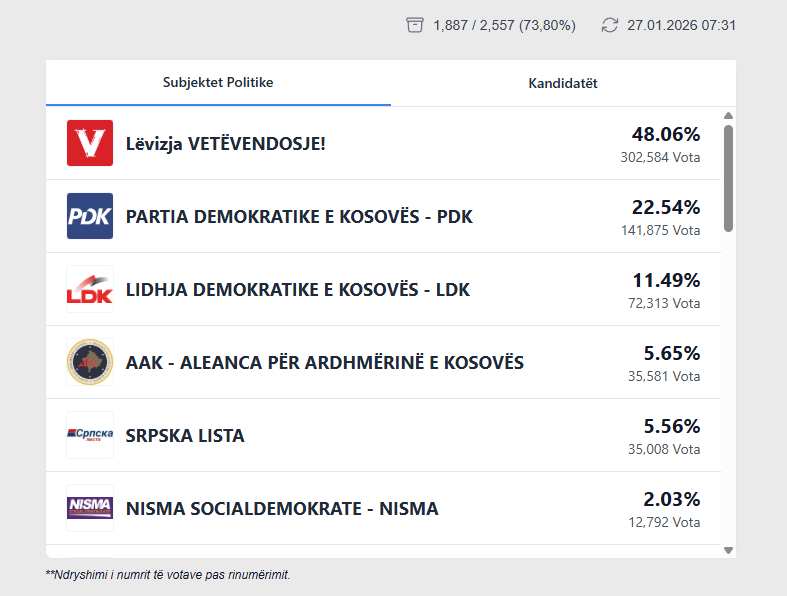 Sipas përditësimit më të fundit të KQZ-së, deri në mëngjesin e së martës janë rinumëruar 1,887 vendvotime, që përbëjnë 73,80% të totalit prej 2,557 vendvotimeve të parashikuara për rinumërim.