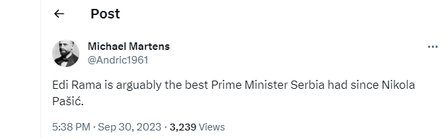 “Edi Rama është padyshim kryeministri më i mirë që ka pasur Serbia që nga Nikola Pashiq”, ka shkruar Martens.