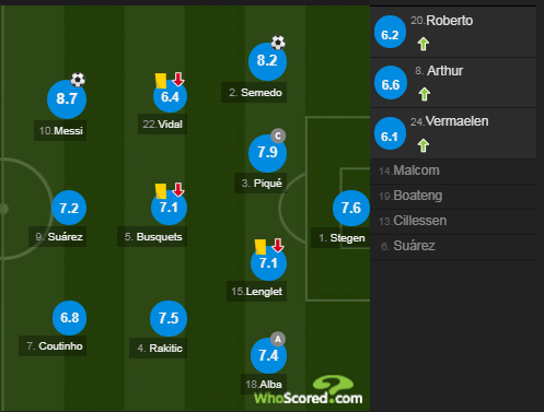 Lojtari më i vlerësuar i ndeshjes ishte pikërisht ylli argjentinas Messi, i cili pas paraqitjes së tij u notua me 8.7.