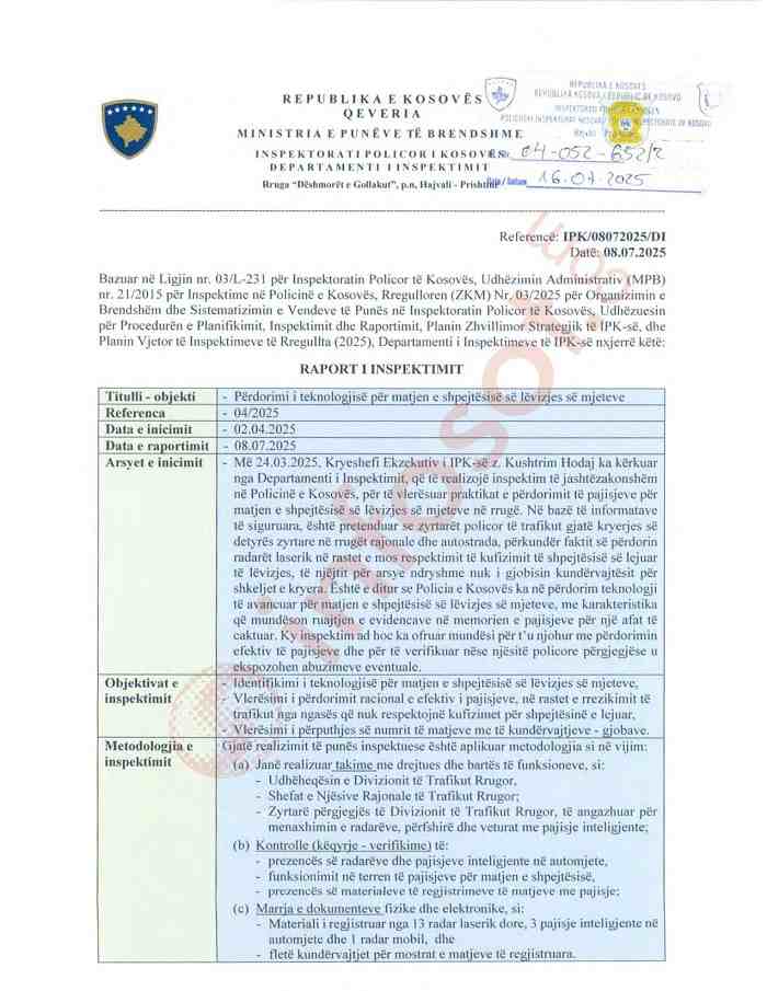 Inspektorati Policor i Kosovës (IPK), përmes një inspektimi të jashtëzakonshëm të realizuar në muajin prill 2025, ka zbuluar një sërë parregullsish dhe mospërdorime të pajisjeve për matjen e shpejtësisë nga njësitë e trafikut rrugor në Policinë e Kosovës. Inspektimi, i kërkuar nga Kryeshefi Ekzekutiv i IPK-së, Kushtrim Hodaj, synonte të vlerësonte përdorimin efektiv të teknologjisë moderne të radarëve dhe pajisjeve inteligjente në luftën kundër kundërvajtjeve në trafik, sidomos në autostrada dhe rrugë rajonale, shkruan Infosot.