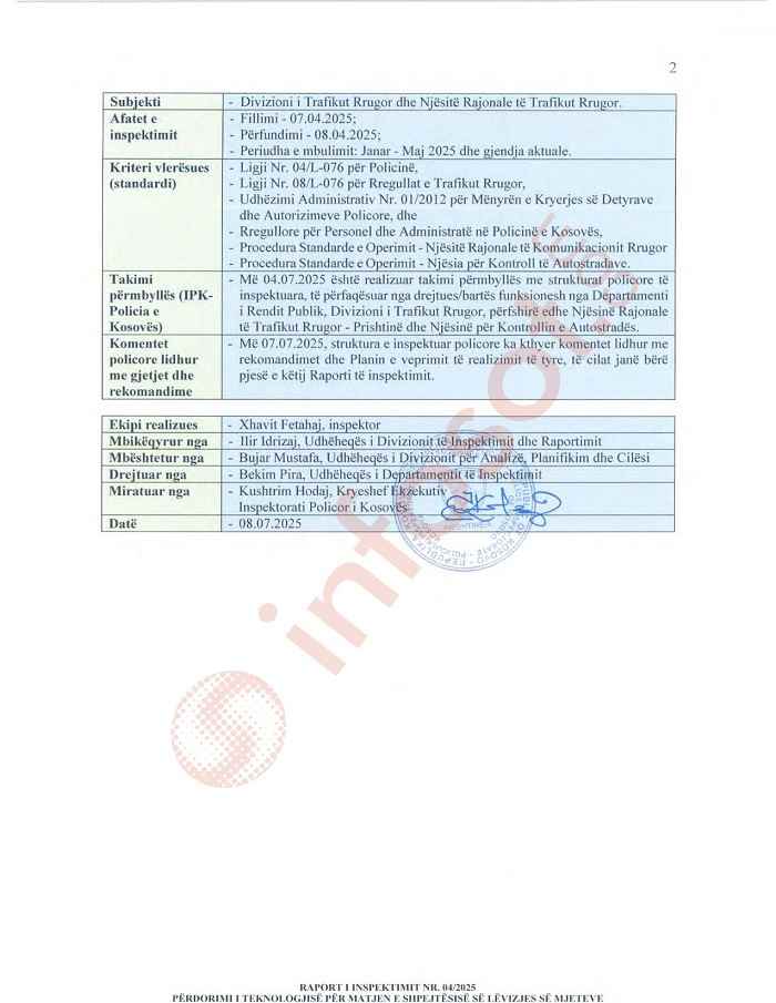 Gjatë inspektimit, i cili u shtri në periudhën janar – maj 2025, IPK analizoi të dhënat nga 13 radarë laserikë dore, 3 pajisje inteligjente në automjete dhe një radar mobil, krahasuar me fletët e kundërvajtjes për të njëjtat mostra. U mbajtën takime me drejtues dhe shefa njësish të trafikut rrugor në nivel qendror dhe rajonal, dhe u verifikua në terren funksionimi i pajisjeve për matjen e shpejtësisë, si dhe mënyra e ruajtjes së të dhënave të incizuara, raporton Infosot.