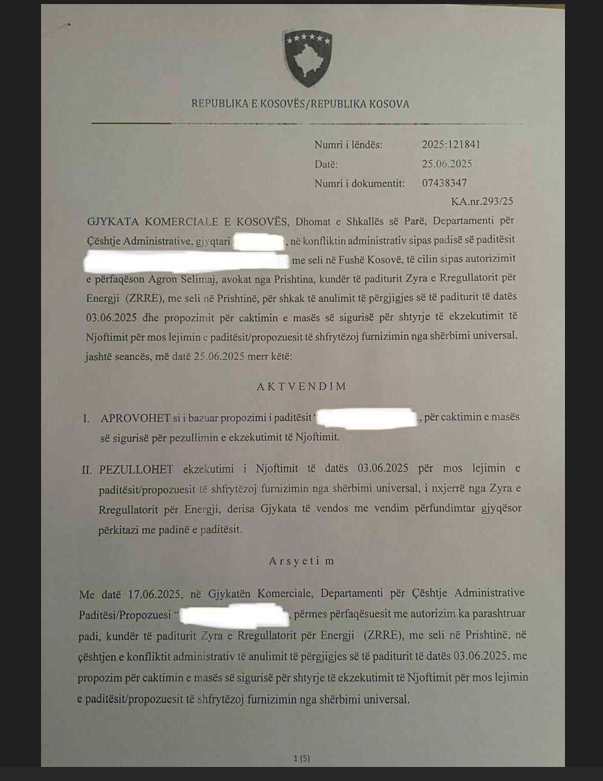 KosovaPress ka siguruar edhe aktvendimin e Gjykatës, në të cilën thuhet se sipas aktvendimit të datës 25 qershor 2025, Gjykata Komerciale, Departamenti për Çështje Administrative, ku thuhet se aprovohet si e bazuar propozimi i paditësit për caktimin e masës së sigurisë për pezullimin e ekzekutimit të njoftimit. Më tej në këtë aktvendim thuhet se pezullohet ekzekutimi i njoftimit të datës 03.06.2025 për mos lejimin e paditësit, propozuesit të shtetëzoj furnizimin nga shërbimi universal, i nxjerr nga zyra e ZRRE, derisa gjykata të vendos me vendim përfundimtar gjyqësor përkitazi me padinë e paditësit.