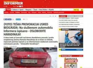 Gazeta shoviniste serbe, Informer, e ka publikuar këtë fotografi me titullin “Provokim i rëndë midis Beogradit. Në veturën zyrtare të Informerit është shkruar: Lirojeni Haradinajt”.