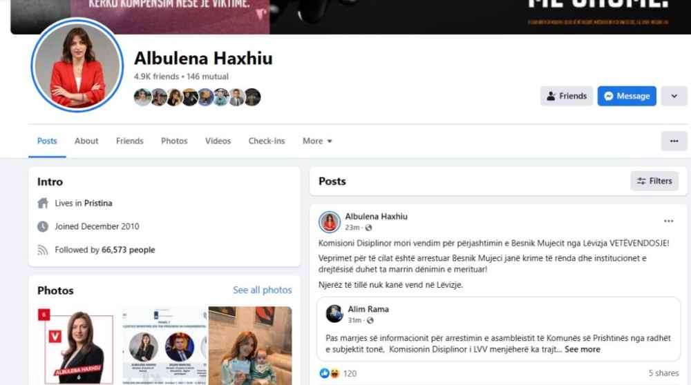 “Veprimet për të cilat është arrestuar Besnik Mujeci janë krime të rënda dhe institucionet e drejtësisë duhet ta marrin dënimin e merituar!”, shkroi ajo në Facebook.