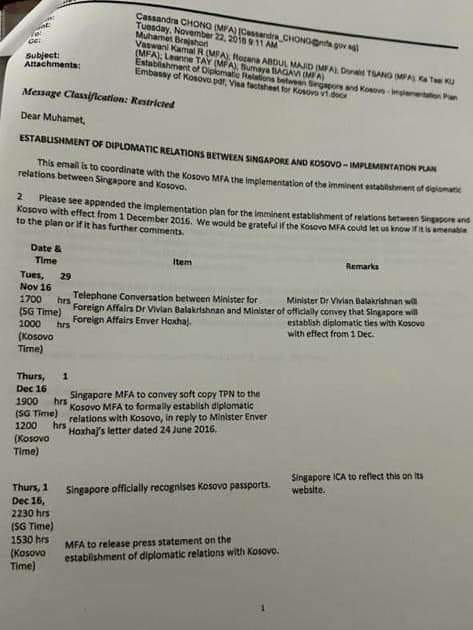 “Në qeverisjen e Albin Kurtit, Kosova nuk e mori asnjë njohje dhe sot Kosova nuk ka as politikë të jashtme, as ministri dhe as diplomaci! Këtë muaj ishte përvjetori i njohjes së Singaporit, ku kjo njohje është marr falë një politike të jashtme të suksesshme të Kosovës, pas disa vizitave në Singapor dhe duke ndjekur hap pas hapi, sikurse tregon ky dokument i komunikimit diplomatik të vitit 2016 në mes të MPJ-së së Singaporit dhe Kosovës!”