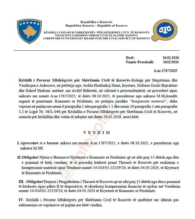 Me vendimin e tij, Këshilli obligon njësinë e burimeve njerëzore të Komunës së Prishtinës që brenda 15 ditësh të ri-procedojë kërkesën për kompensim në Thesarin e Kosovës. Po ashtu, Drejtori i Përgjithshëm i Thesarit është obliguar që brenda 15 ditësh nga pranimi i kërkesës ta ekzekutojë kompensimin financiar.