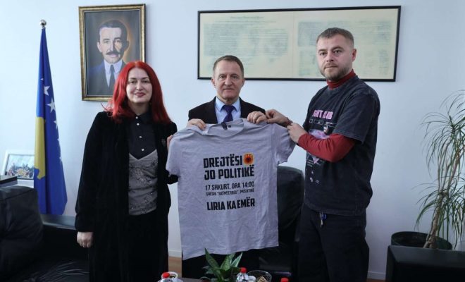Përfaqësuesit e platformës “Liria ka Emër”, Eliza Hoxha dhe Ismail Tasholli, janë pritur sot në takim nga kryetari i Komunës së Vushtrrisë, Ferit Idrizi dhe kabineti i tij, të cilët u kanë ofruar përkrahje për Marshin “Drejtësi, jo politikë”, i cili do të mbahet më 17 shkurt në Prishtinë, në mbrojtje të drejtësisë së paanshme dhe të vlerave të luftës çlirimtare.