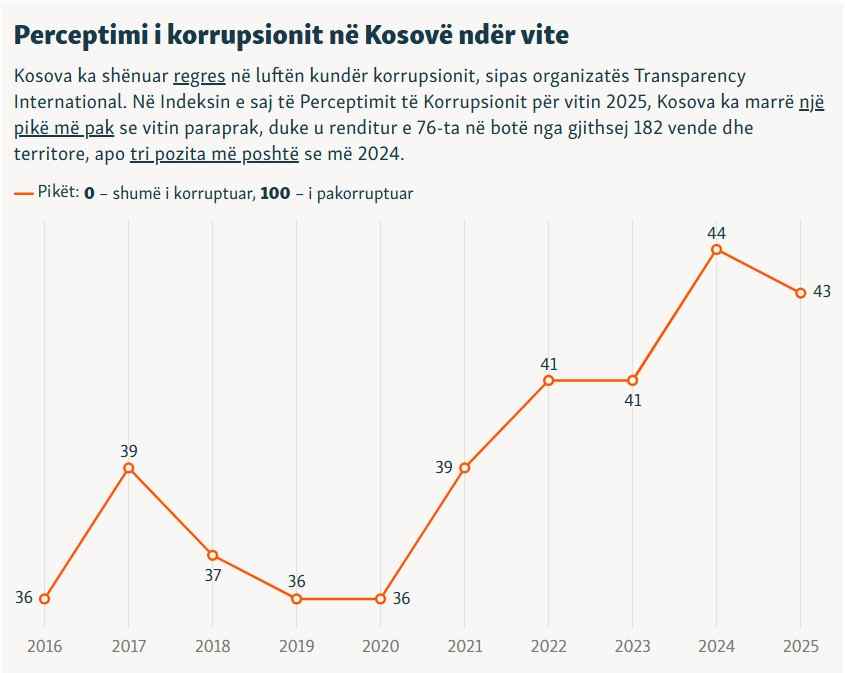 Kosova është vlerësuar me 43 pikë në Indeksin e Perceptimit e Korrupsionit për vitin 2025 të organizatës ndërkombëtare, Transparency International (TI), duke shënuar një rënie për një pikë krahasuar me vitin paraprak.