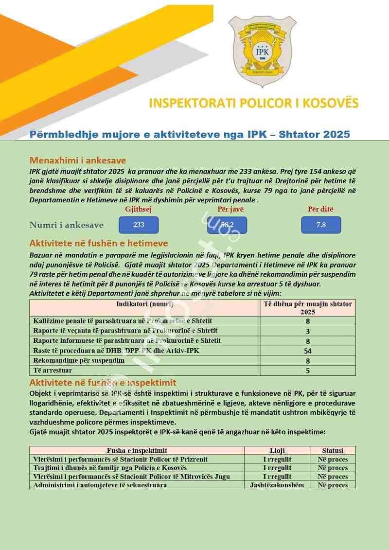 5 zyrtarë të Policisë së Kosovës janë arrestuar vetëm në muajin shtator të këtij viti si shkak i dyshimeve në përfshirje në veprime të kundërligjshme. Sipas raportit të Inspektoratit Policor të Kosovës (IPK), gjatë shtatorit janë pranuar dhe menaxhuar gjithsej 233 ankesa, duke shënuar një nivel të lartë të aktivitetit hetimor dhe disiplinor brenda sistemit policor, raporton Infosot.