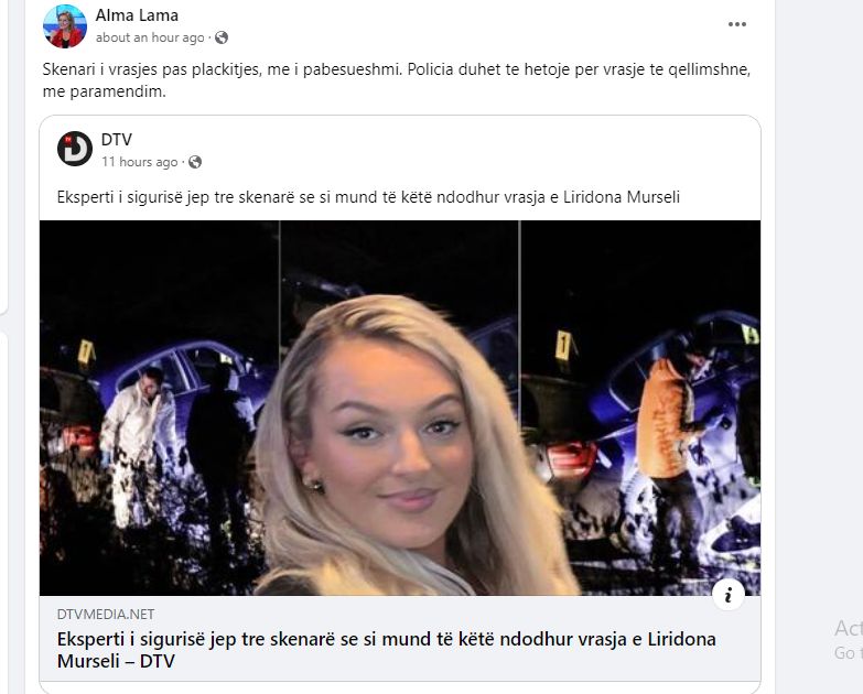 Një deklaratë goxha e fortë dhe e rëndë vjen nga ish-deputetja e LDK-së, Alma Lama, në lidhje me vrasjen e Liridona Murselit, gruan e ish-këshilltarit të Behgjet Pacollit, Naim Murseli.