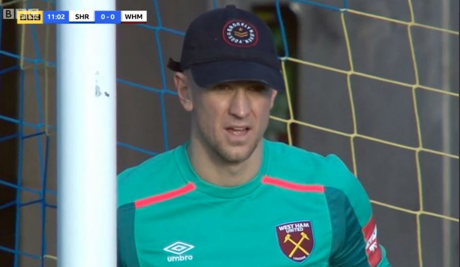 A Joe Hart, arquero del West Ham, le molestaba el sol en el partido por #FACup en Inglaterra, y un hincha le prestó una con escudo de béisbol!!