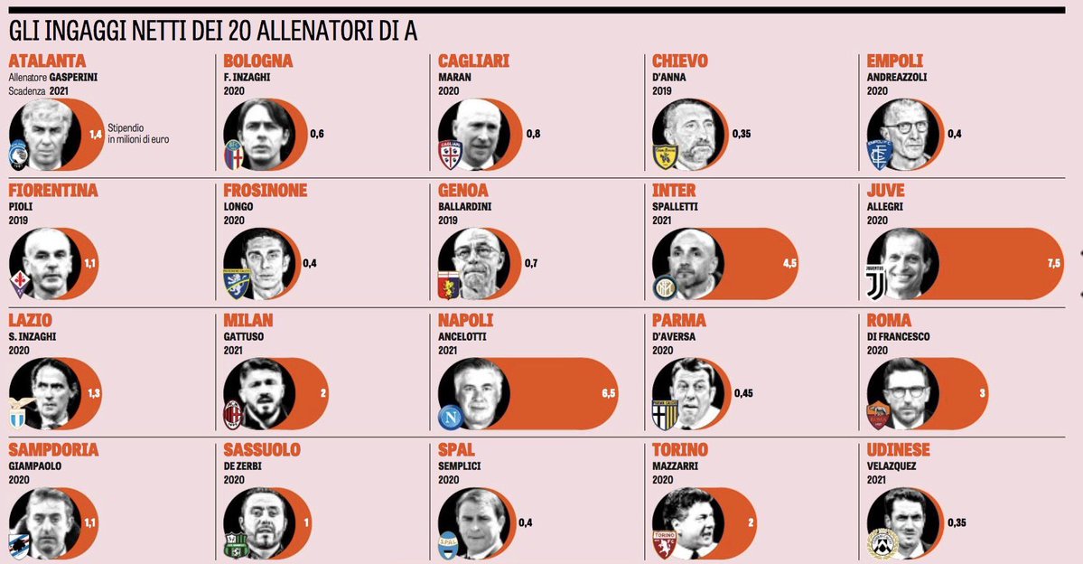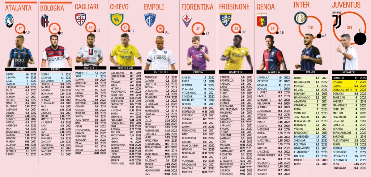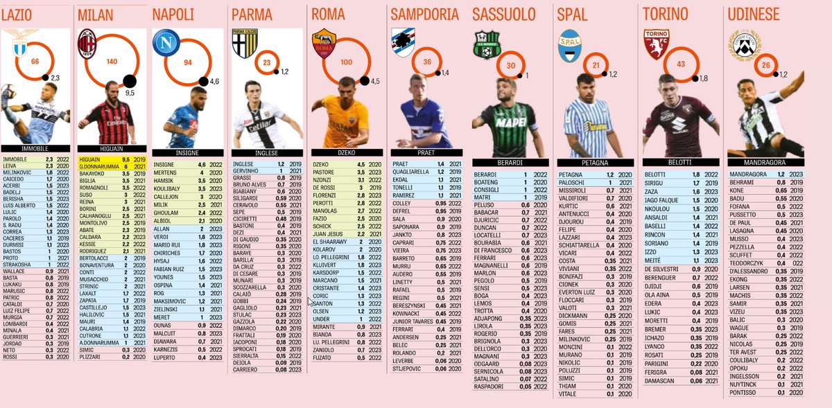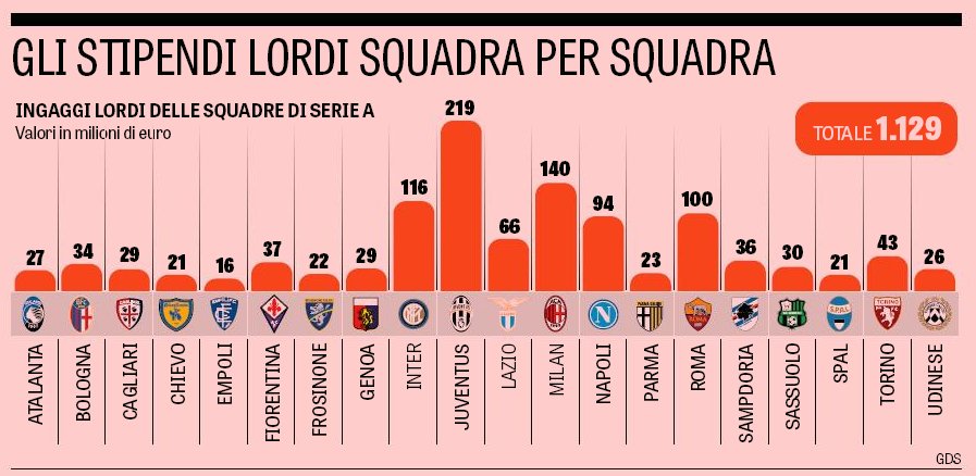 Lista e plotë: Napoli (94 milionë), Lazio (66 milionë), Torino (43 milionë), Fiorentina (37 milionë), Sampdoria (36 milionë), Bologna (34 milionë), Sassuolo (30 milionë), Cagliari (29 milionë), Genoa (29 milionë), Atalanta (27 milionë), Udinese (26 milionë), Parma (23 milionë), Frosinone (22 milionë), Chievo (21 milionë), SPAL (21 milionë) dhe në fund Empoli me shpenzime vjetore për rroga të lojtarëve në vlerë 16 milionë euro.