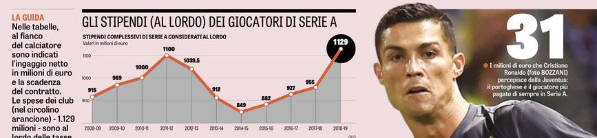 Juventusi është klubi që paguan më së shumti lojtarët, Zonja e Vjetër për një sezon shpenzon 219 milionë euro në rroga, e ndjekur nga Milani (140 milionë), Interi (116 milionë) dhe Roma me 100 milionë euro.