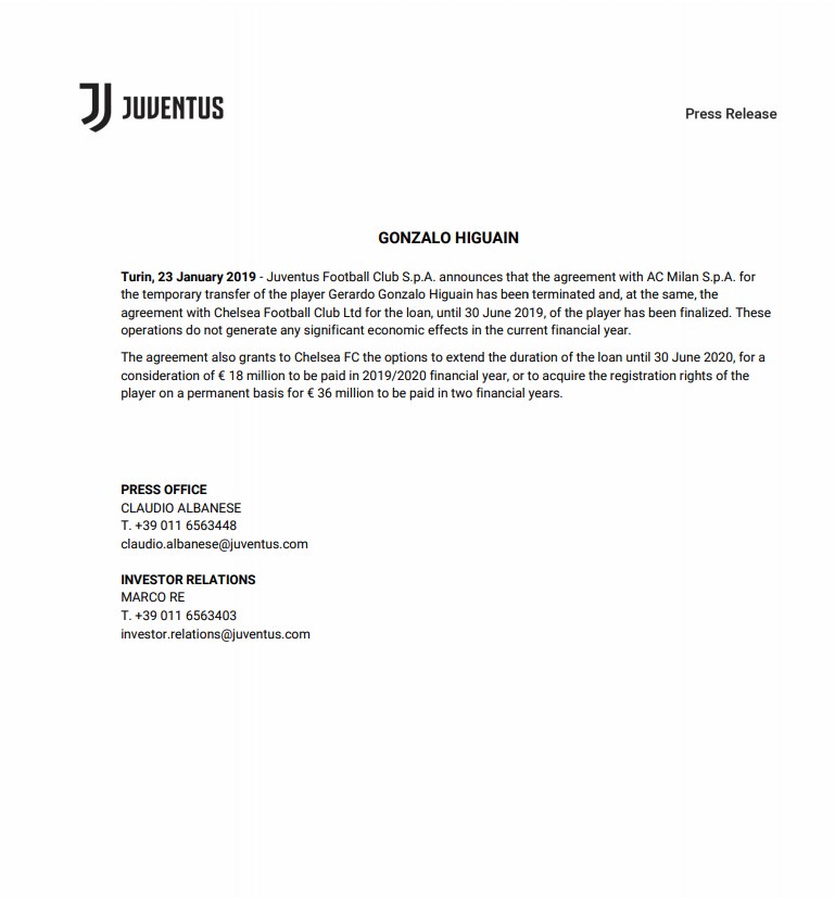“Juventus Football Club S.p.A. e konfirmon marrëveshjen me AC Milan S.p.A për mbylljen e huazimit të Gerardo Gonzalo Higuain, duke e vazhduar të njëjtën marrëveshje me Chelsea Football Club si huazim deri më 30 qershor 2019”.