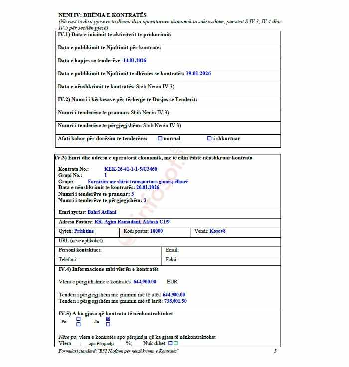 Ligji i Prokurimit Publik e ndalon dhënien e kontratës me negocim, vetëm në raste të jashtëzakonshme, apo kur asnjë operator nuk e ofron atë produkt. KEK më 20 janar ka nënshkruar zyrtarisht kontratën me operatorin ekonomik Bahri Asllani, duke negociuar kontratën më vlerë prej 644 mijë euro.