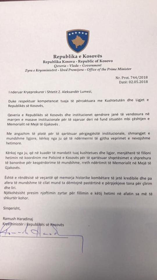 “Sot, ju kam drejtuar Kryeprokurorit të Shtetit Aleksandër Lumezit që në mandatin e tij ligjor të fillojë menjëherë, në kordinim me Policinë e Kosovës, hetimin për keqpërdorimet të cilat janë shprehur si shqetësim nga banorët rreth ndërtimit të Memorialit në Mejë të Gjakovës.