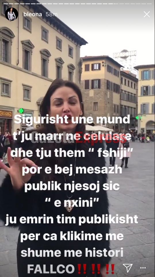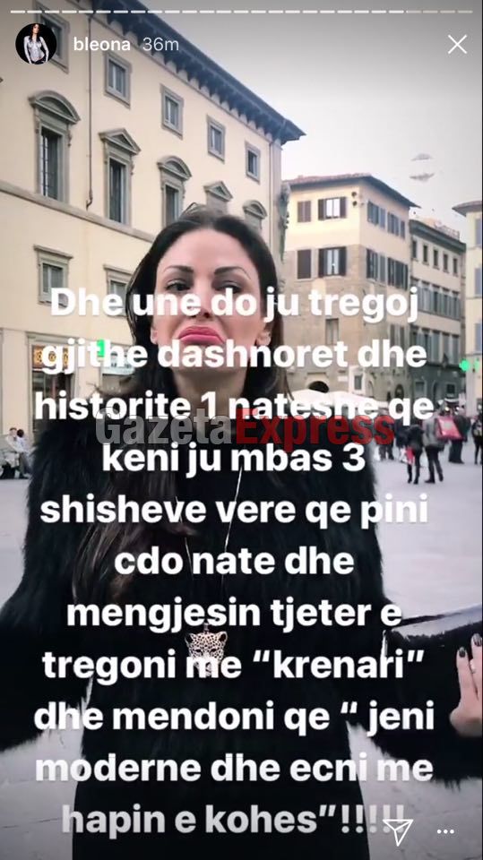 ‘Nëse nuk i fshini, unë do të tregoj gjithë dashnorët që keni. Sepse unë nuk jam si ju që pini tre shishe verë dhe flini me të vetmin person që ju çon në shtëpi atë natë dhe pas një muaji shkoni abortoni në gjirize. Këto jeni ju, nuk jam unë. Jeni ju ato që bëni fëmijë me një njeri kë të gjeni në rrugë. Se duhet bërë një fëmijë, s’ka rëndësi a ia dua babën. Ato jeni ju, jo unë.”- ka thënë Bleona në videot e një pas njëshme të publikuara në Insta Story. /Gazeta Express/