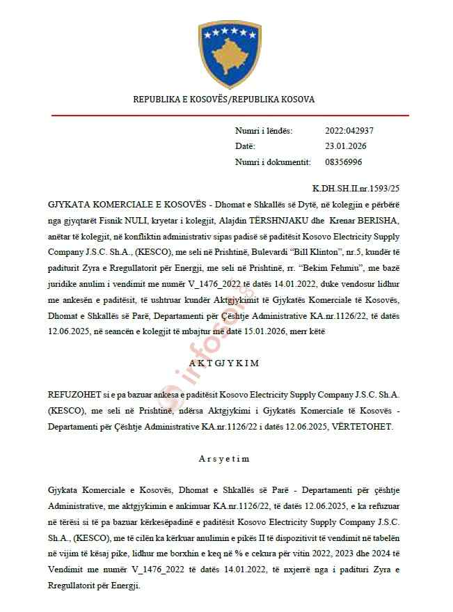 Sipas aktgjykimit të vitit 2026, gjykata ka vlerësuar se ankesa e KESCO-s ishte e pabazuar dhe se vendimi i shkallës së parë është marrë në përputhje me ligjin dhe provat e paraqitura. Në këtë mënyrë, mbetet në fuqi vendimi i ZRRE-së i vitit 2022, i cili përcakton disa parametra financiarë për llogaritjen e tarifave të energjisë për periudhën 2022-2024.