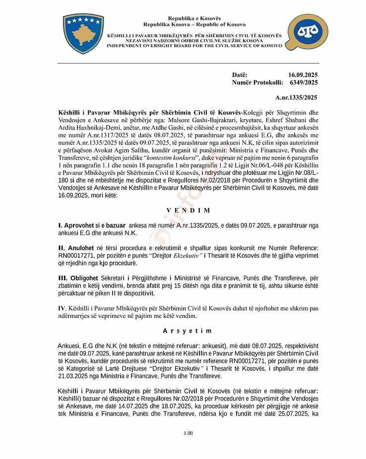 një nga pozitat më të larta drejtuese brenda Ministrisë së Financave. Ky vendim vjen pas ankesave të dy kandidatëve E.G dhe N.K të cilët pretendojnë se procedura e rekrutimit ishte zhvilluar në kundërshtim me rregullat ligjore, raporton Infosot.