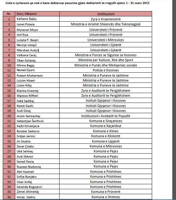 Shtatëdhjetë e një zyrtarë të lartë publikë nuk e kanë deklaruar pasurinë e tyre dhe nuk kanë dhënë ndonjë arsye gjatë procesit të rregullt vjetor të deklarimit të pasurisë, kurse katër zyrtarë të tjerë të cilët nuk e kanë deklaruar pasurinë kanë dhënë arsyet objektive të mos deklarimit, (gjenden jashtë vendit për shërim ose janë në paraburgim).