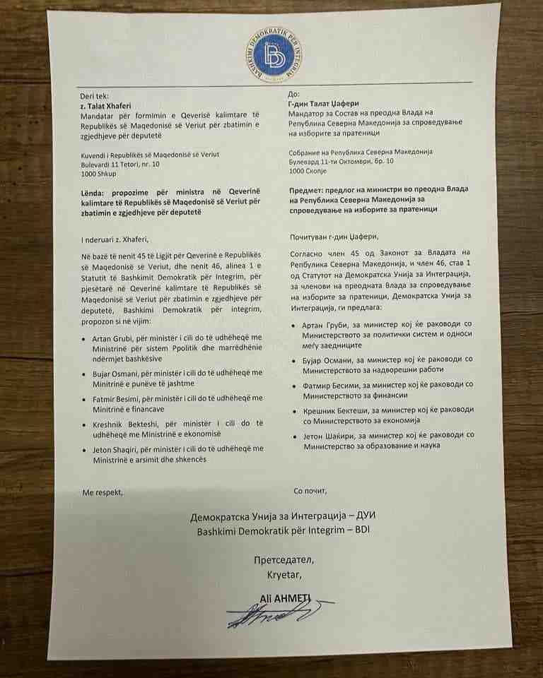 Ai për vazhdimin e mbajtjes së kësaj pozite u propozua nga kryetari i partisë BDI, Ali Ahmeti, krahas me disa emra të tjerë shqiptarë për pozita në qeverinë kalimtare të Maqedonisë së Veriut.