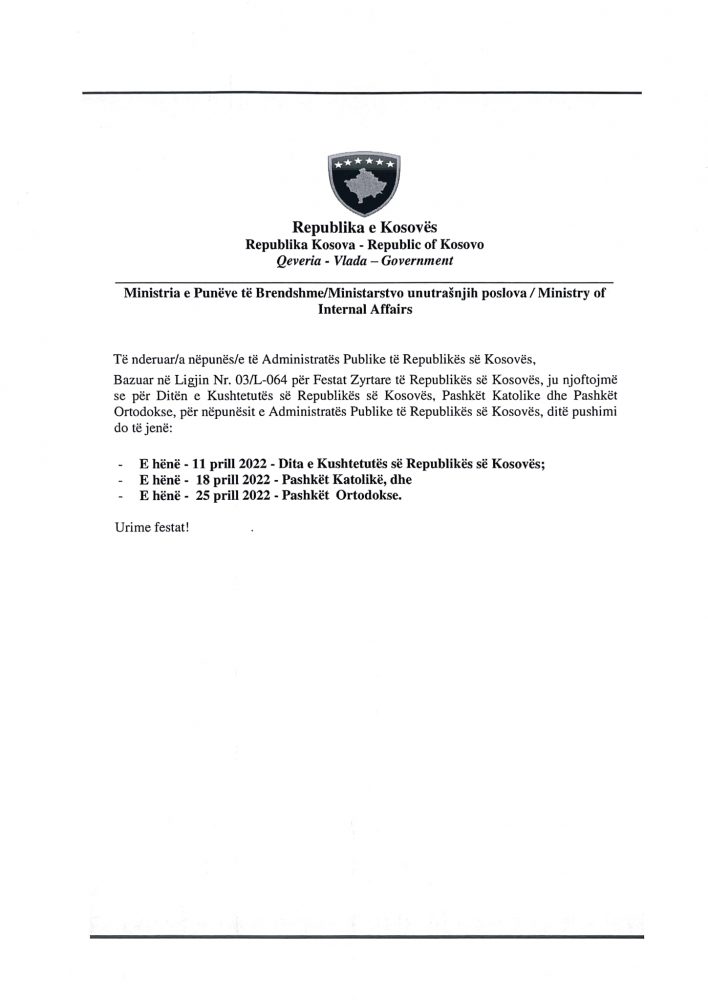 Ata do të pushojnë për Ditën e Kushtetutës, Pashkët Katolike dhe Pashkët Ortodokse, bazuar në Ligjin për Festat Zyrtare.