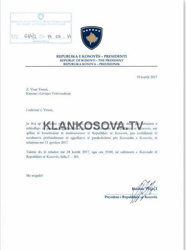 Klan Kosova ka siguruar ftesat, më poshtë gjeni ftesën që presidenti i vendit i ka dërguar kreut të Lëvizjes Vetëvendosje, Visar Ymeri.