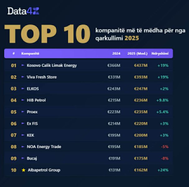 Në bazë të këtyre të dhënave del se kompania turke, Kosovo Calik Limak Energy, është kompania më e madhe në vend me qarkullim, ku krahasuar me vitin e kaluar qarkullimi i saj është rritur për 19% apo nga 366 milionë në 2024 në 437 milionë euro në 2025.
