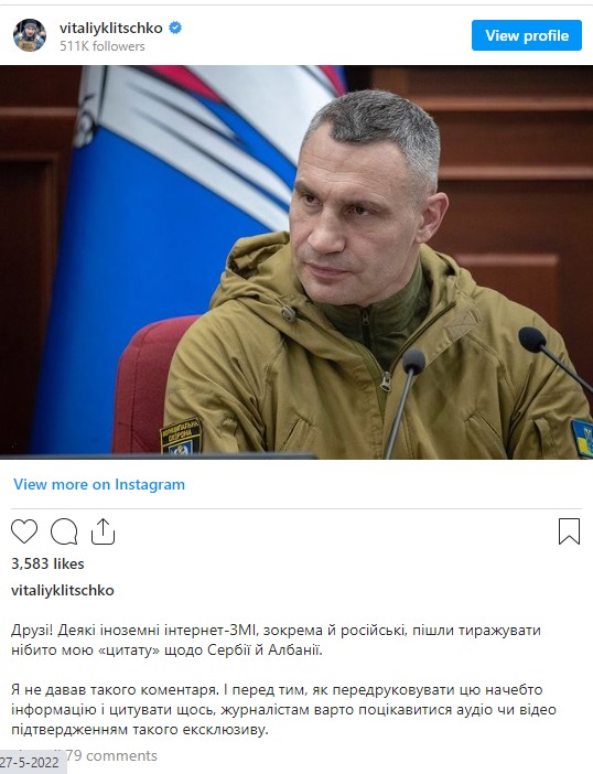“Miq! Disa media të huaja online, përfshirë ato ruse, vazhduan të përhapin citimin tim të pretenduar për Serbinë dhe Shqipërinë. Unë nuk komentova. Edhe para se të përcjellin këtë informacion të supozuar dhe të citojnë diçka, gazetarët duhet të kërkojnë konfirmim audio ose video të një deklarate të tillë”, ka shkruar Klitschko në Instagram.