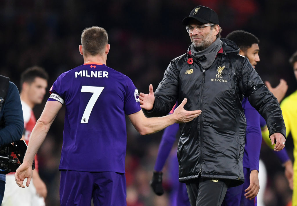 James Milner dhe Jurgen Klopp pas barazimit ndaj Arsenalit në Emirates (Foto: Michael Regan/Getty Images/Guliver)