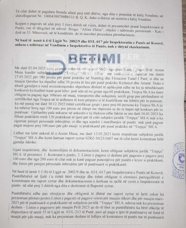 “Mirëpo, pas pranimit të praktikantëve subjekti juridik “Trepça” nuk ka zbatuar detyrimet të cilat janë përcaktuar për aplikim sipas konkursit dhe ka cenuar të drejtat e tyre si në aspektin e marrëdhënies së punës po ashtu edhe në aspektin e sigurisë dhe shëndetit në punë…”, thuhet në vendimin e Inspektoratit që vepron në kuadër të Ministrisë së Financave, Punës dhe Transfereve.
