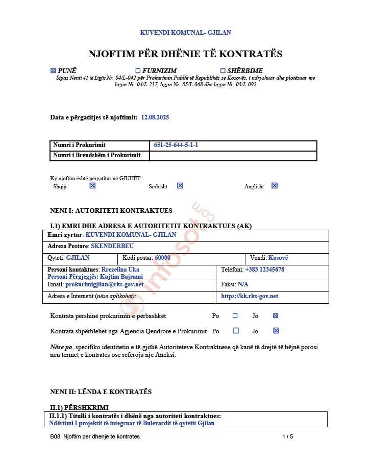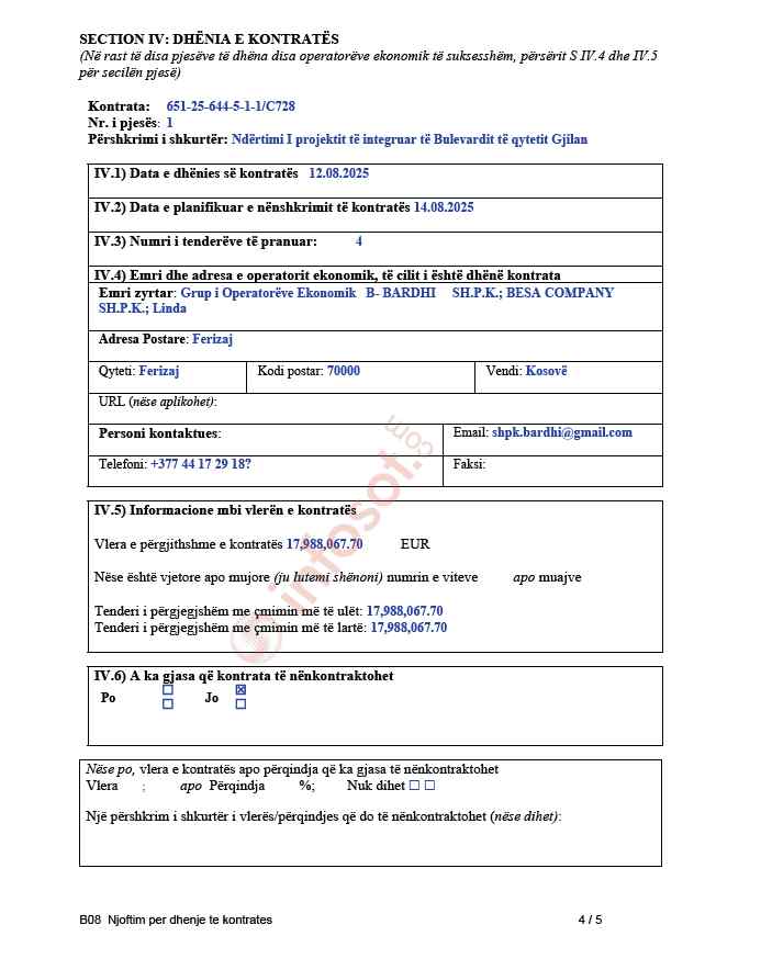 Kontrata e madhe 17 milionë e 988 mijë euro për ndërtimin e bulevardit të qytetit të Gjilanit i është dhënë Grupit të Operatorëve Ekonomik: B-BARDHI SH.P.K., BESA COMPANY SH.P.K. dhe Linda, të cilët do të realizojnë të gjitha fazat e projektit pa nënkontraktim të mëtejshëm, raporton Infosot.