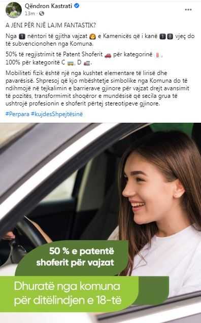 Me anë të një postimi në Facebook, Kastrati bëri të ditur se që nga muaji i ardhshëm Komuna do të financojë shpenzimet për regjistrim të patentë shoferit për të gjitha vajzat e Kamenicës që i kanë 18 vjeç.