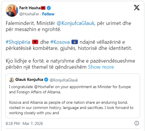Glauk Konjufca, ministër për Punë të Jashtme dhe Diasporë i Kosovës, e ka uruar Ferit Hoxhën, për emërimin e tij si ministër për Evropën dhe Punët e Jashtme të Shqipërisë.
